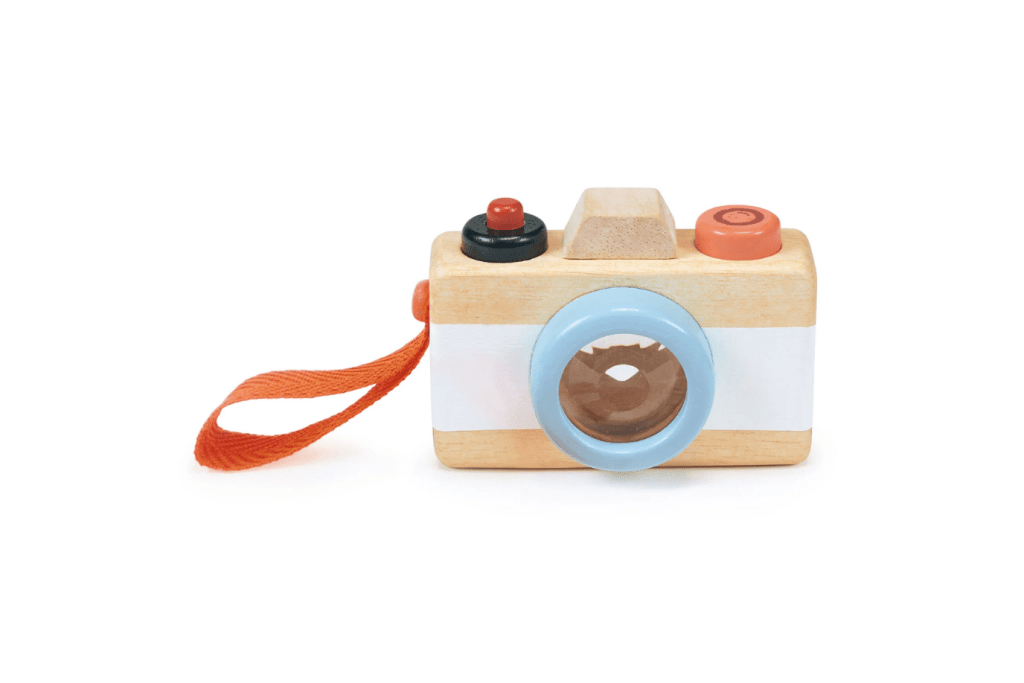 This pretend wooden camera comes complete with a squishy button and kaleidoscope lens. The compact size makes it easy to bring with you on your travels. Comes with a wristlet. Recommended for ages 2 years+