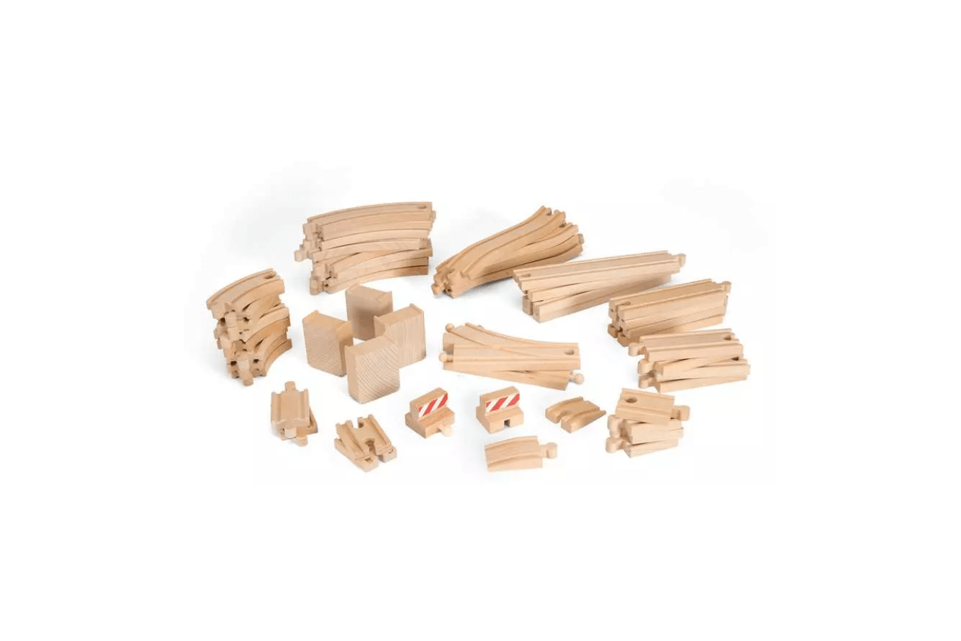 Add to your existing BRIO World railway with this expansion pack of 50 wooden tracks. Create bigger layouts and new adventures with straight, curved, switching and ascending tracks as well as other track accessories like ramps and stops.