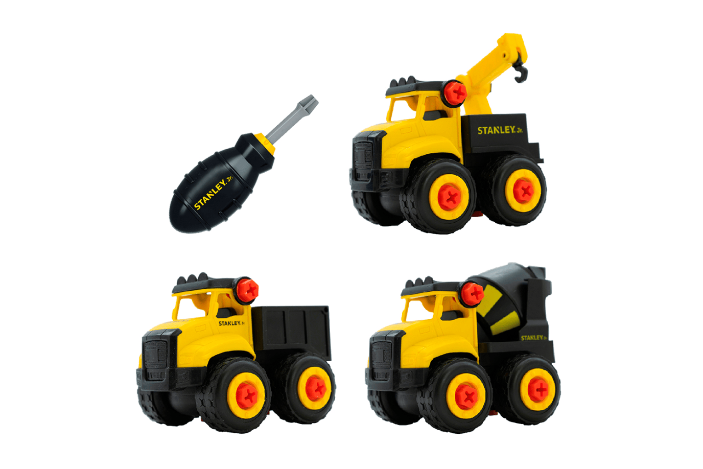 This 3-piece set includes the Stanley Jr. Take Apart Tow Truck, Take Apart Cement Truck, and Take Apart Tipper Truck, along with a Mini Screwdriver Set—everything needed for hours of engaging, open-ended play.