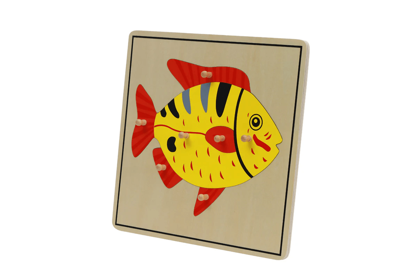 Wooden puzzle with plastic knobs that illustrates the parts of a fish.