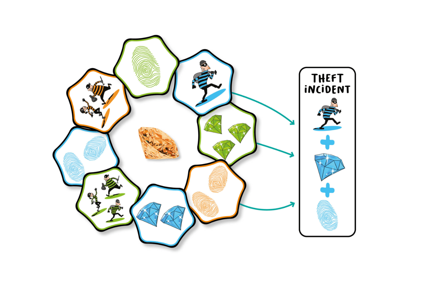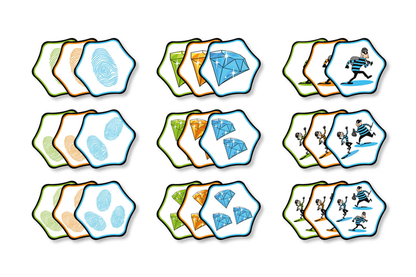 How to Play: Be the first to spot a combination of a Thief card, a Fingerprint card and a Diamond card that all 3 contain the same or a different number of elements. Be the fastest player to grab the diamond in the middle, indicate the theft incident and collect cards.