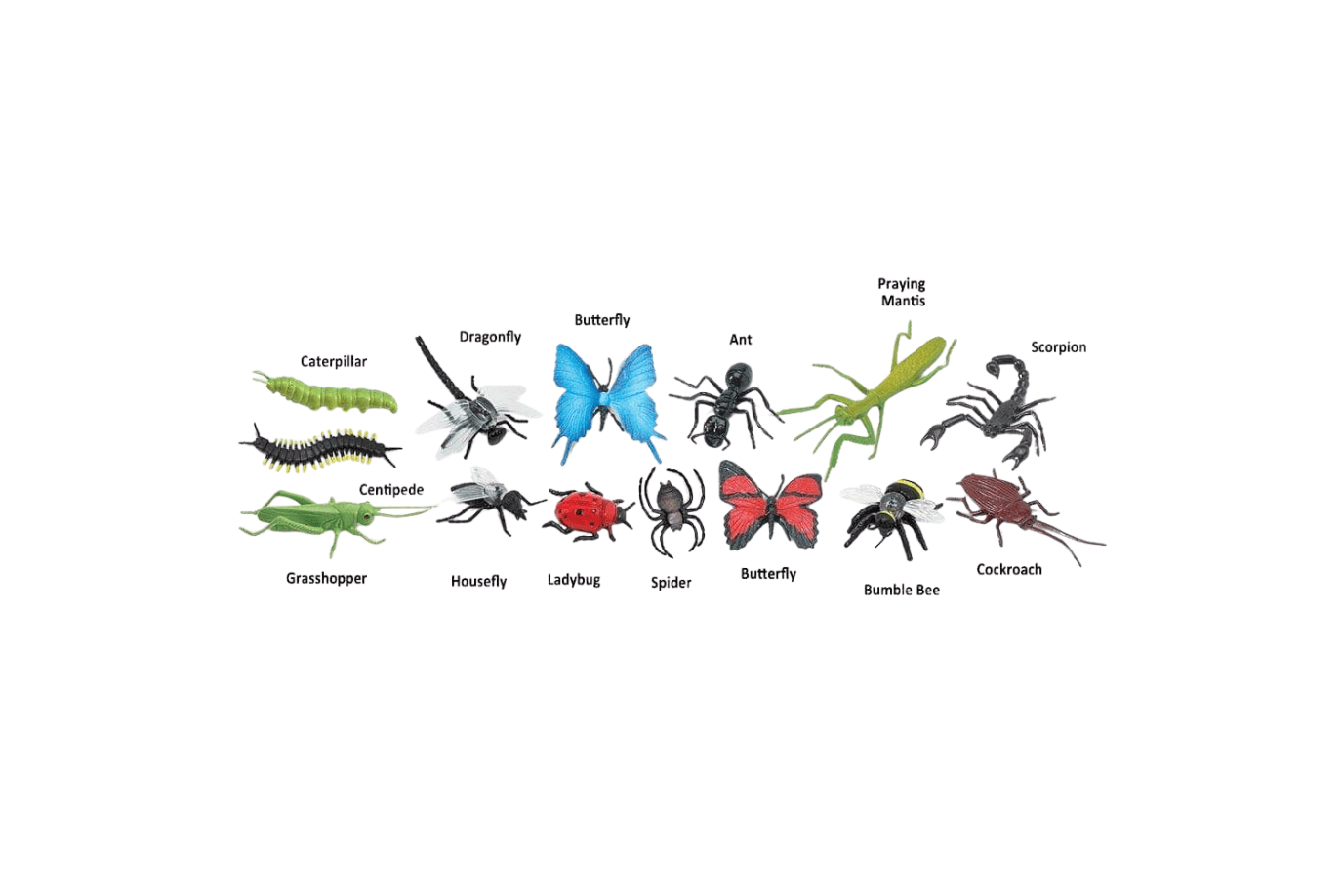 Includes 14 unique critters such as caterpillars, grasshoppers, dragonflies, centipedes, spiders, scorpions, house flies, ladybugs, honeybees, praying mantises, ants, and two types of butterflies.