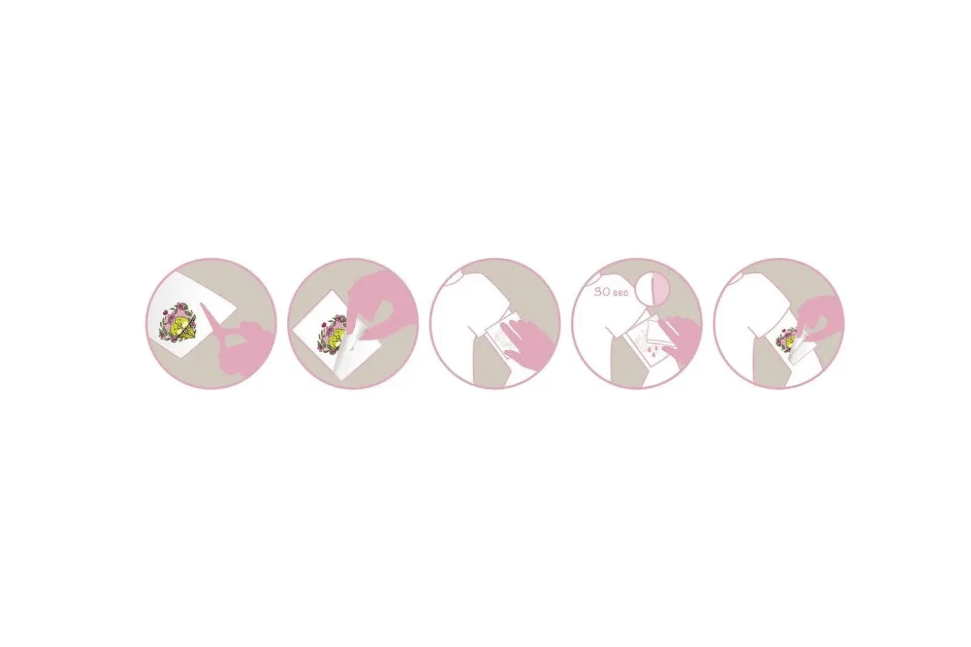 Simply cut out a design, remove the protective sheet and apply the design to your child's skin. Then rub for 30 seconds with a wet washcloth and gently remove the translucent foil.