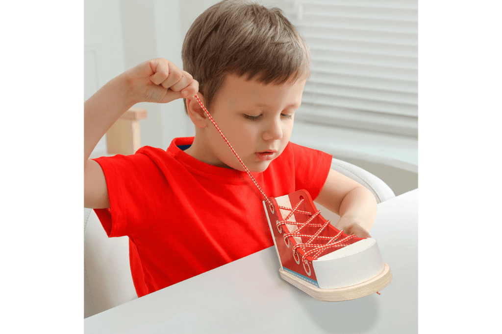 This wooden Learn to lace shoe is a great tool for developing independence and building confidence because it takes away the pressures of learning while also trying to get out the door.
